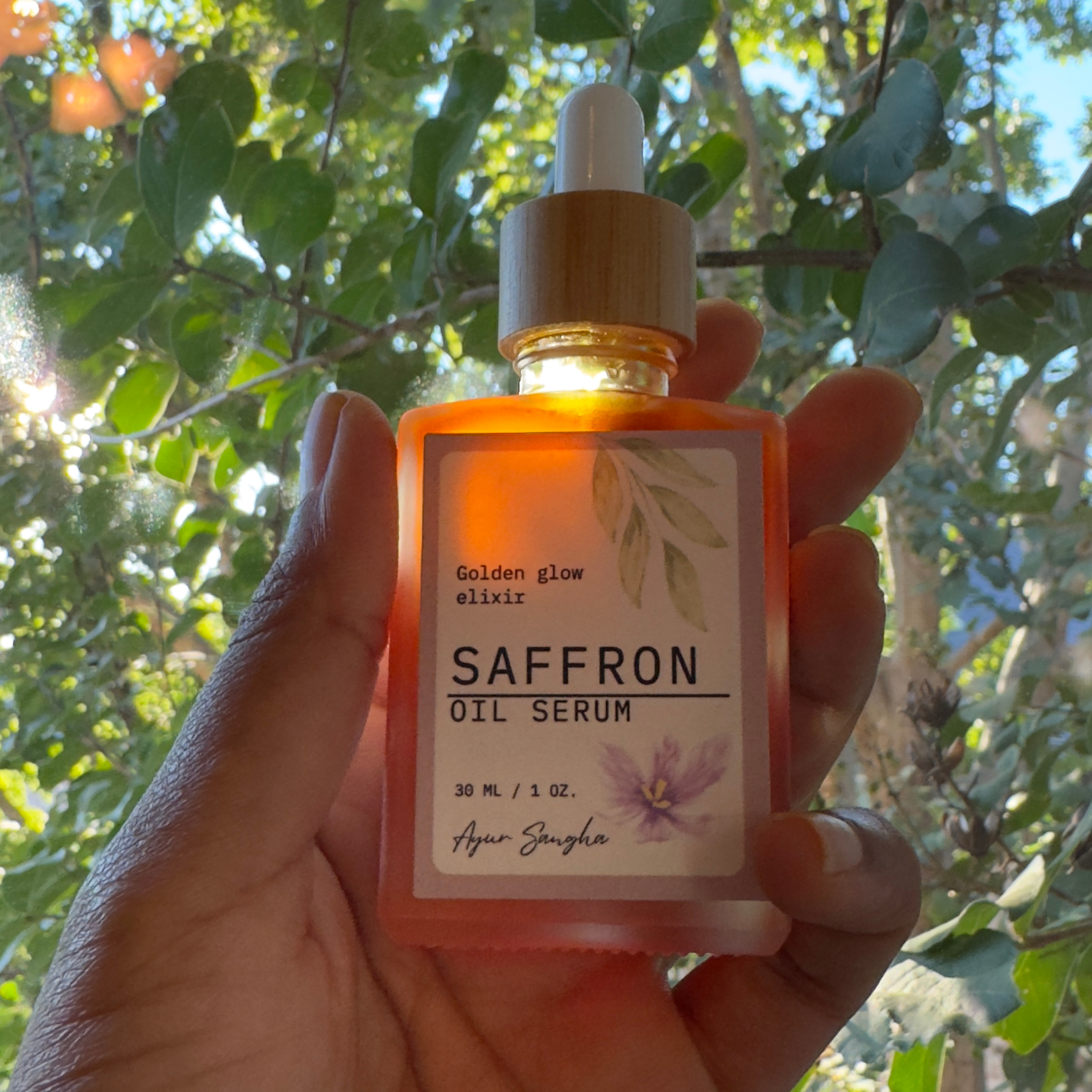 Unlock the secret to radiant, youthful skin with our Golden Glow Elixir, a luxurious saffron oil serum. Inspired by the ancient Ayurvedic recipe of Kumkumadi Thailam, this potent serum combines saffron, known for its brightening properties, with a blend of time-honored botanicals. Each drop contains the goodness of Himalayan cherry, licorice for skin clarity, and the moisturizing richness of goat’s milk and sesame seed oil. This formula is meticulously crafted to reduce hyperpigmentation, erase fine lines, and restore a natural, luminous glow to your complexion.Benefits:Brightens and evens skin tone: Saffron and licorice work synergistically to lighten dark spots and even out skin tone, giving you a vibrant, uniform complexion.Reduces signs of aging: Infused with Himalayan cherry and other botanical extracts, this serum minimizes the appearance of wrinkles and fine lines.Deeply moisturizes: Sesame seed oil and goat's milk provide deep hydration, ensuring your skin remains soft and supple.Enhances skin’s natural glow: Regular use of this serum rejuvenates the skin, enhancing its natural glow and making it look healthy and revitalized.How to Use: Take 2-3 drops in your hand. Massage the oil onto a clean face and neck. For best results use it as part of nighttime routine. Wear sunscreen if using in the AM. Enjoy your natural glow!Perfect for all skin types, including oily and troubled skin, this serum is essential to your daily skincare ritual to achieve and maintain a radiant complexion.